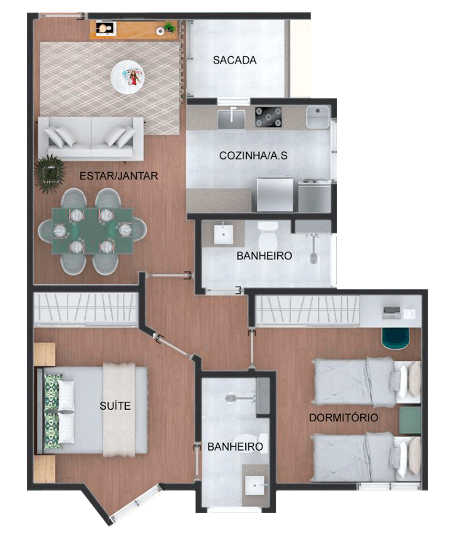 Conheça por dentro o seu apartamento dos sonhos, onde você vai passar por momentos incríveis com a sua família e seus amigos na sala de estar, de jantar, sacada, cozinha, banheiros e nos dormitórios